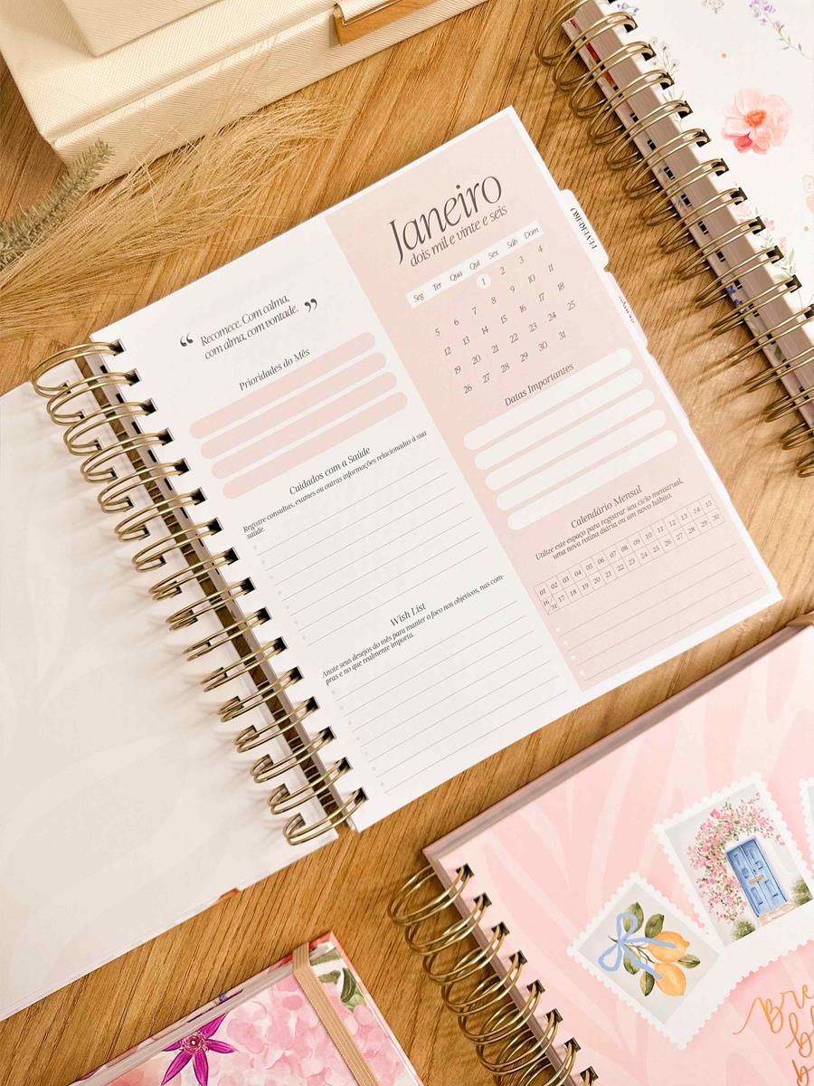 Planeje seu ano com praticidade, elegância e todos os recursos que você precisa para ter um 2026 mais leve e organizado. Cada detalhe deste planner foi pensado para facilitar sua rotina e inspirar você a alcançar seus objetivos.