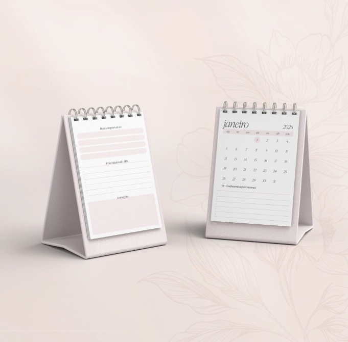 O calendário de mesa é ideal para quem busca organização com praticidade. Produzido em papel de alta qualidade 90g, oferece resistência e ótimo acabamento, garantindo durabilidade durante todo o ano.