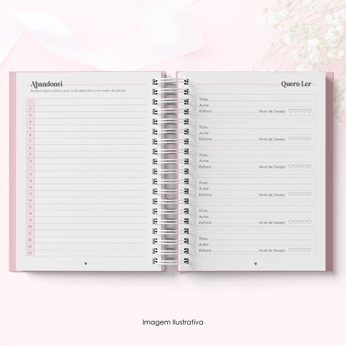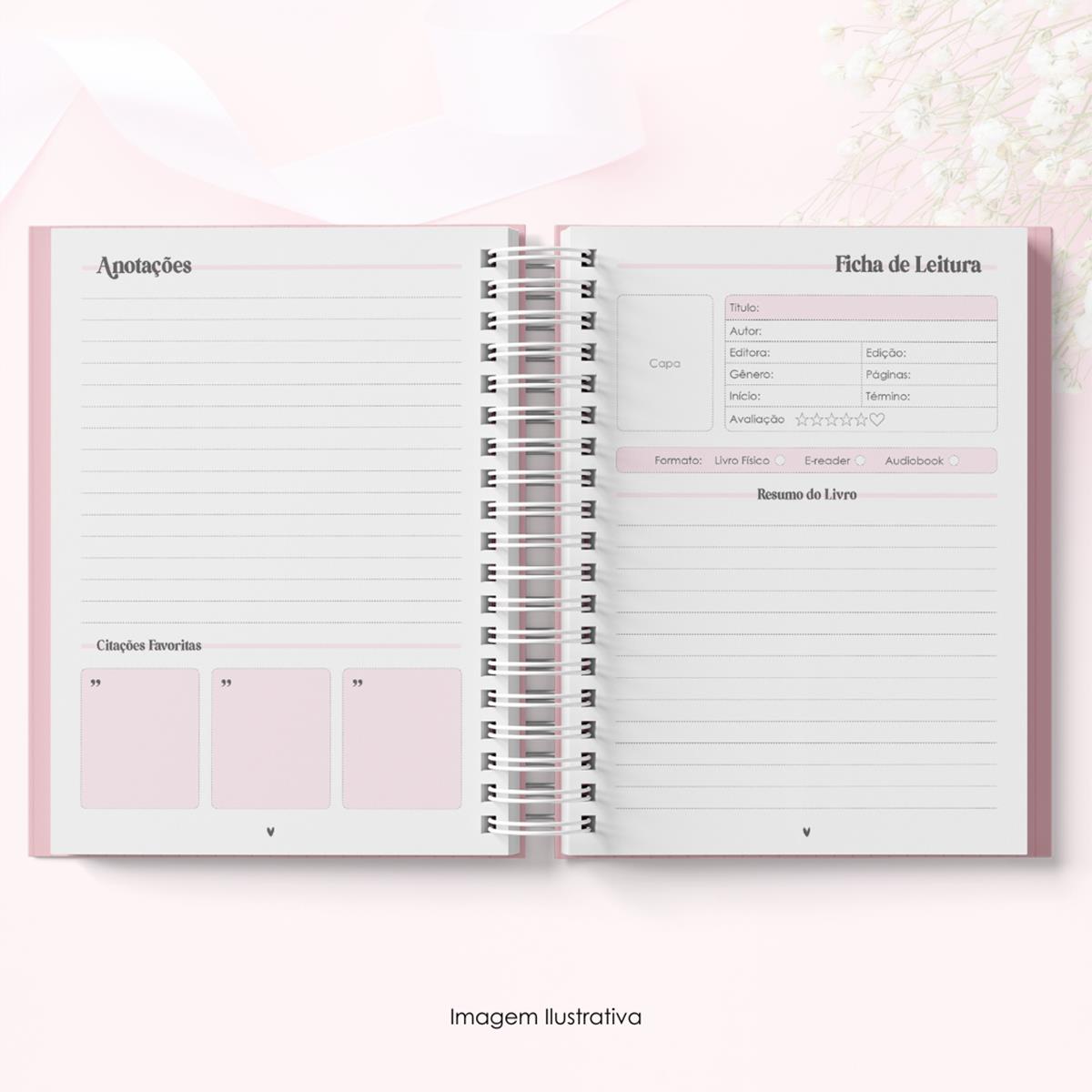 - Ficha de leitura: Páginas dedicadas para registrar os dados do livro, avaliação, resumo e comentários.