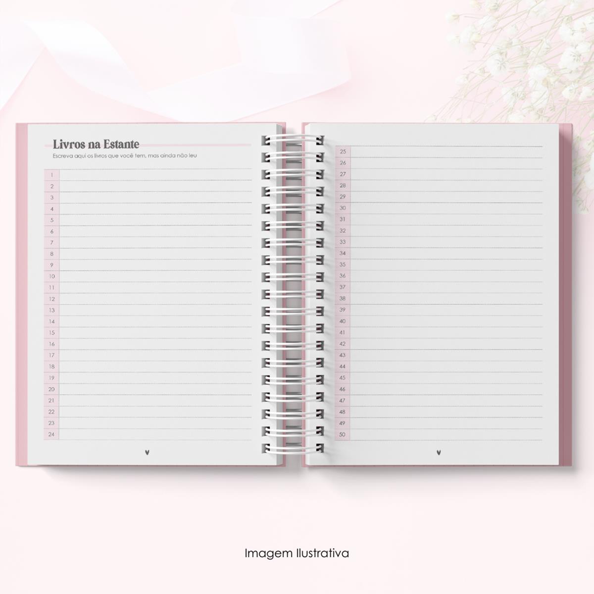 - Ficha de leitura: Páginas dedicadas para registrar os dados do livro, avaliação, resumo e comentários.