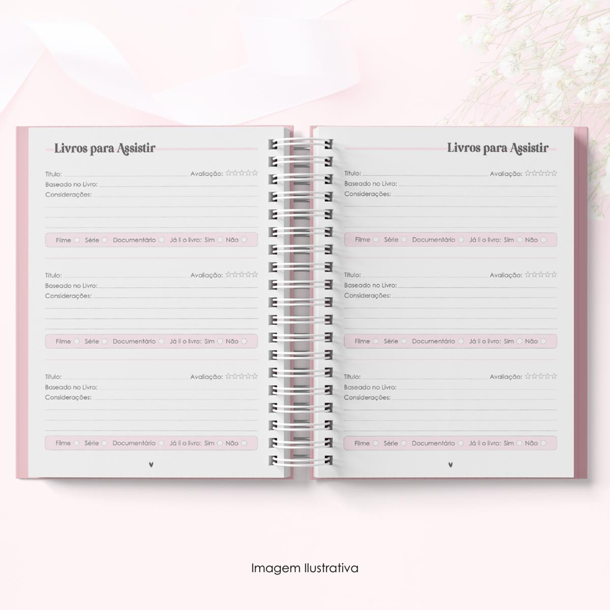 - Ficha de leitura: Páginas dedicadas para registrar os dados do livro, avaliação, resumo e comentários.