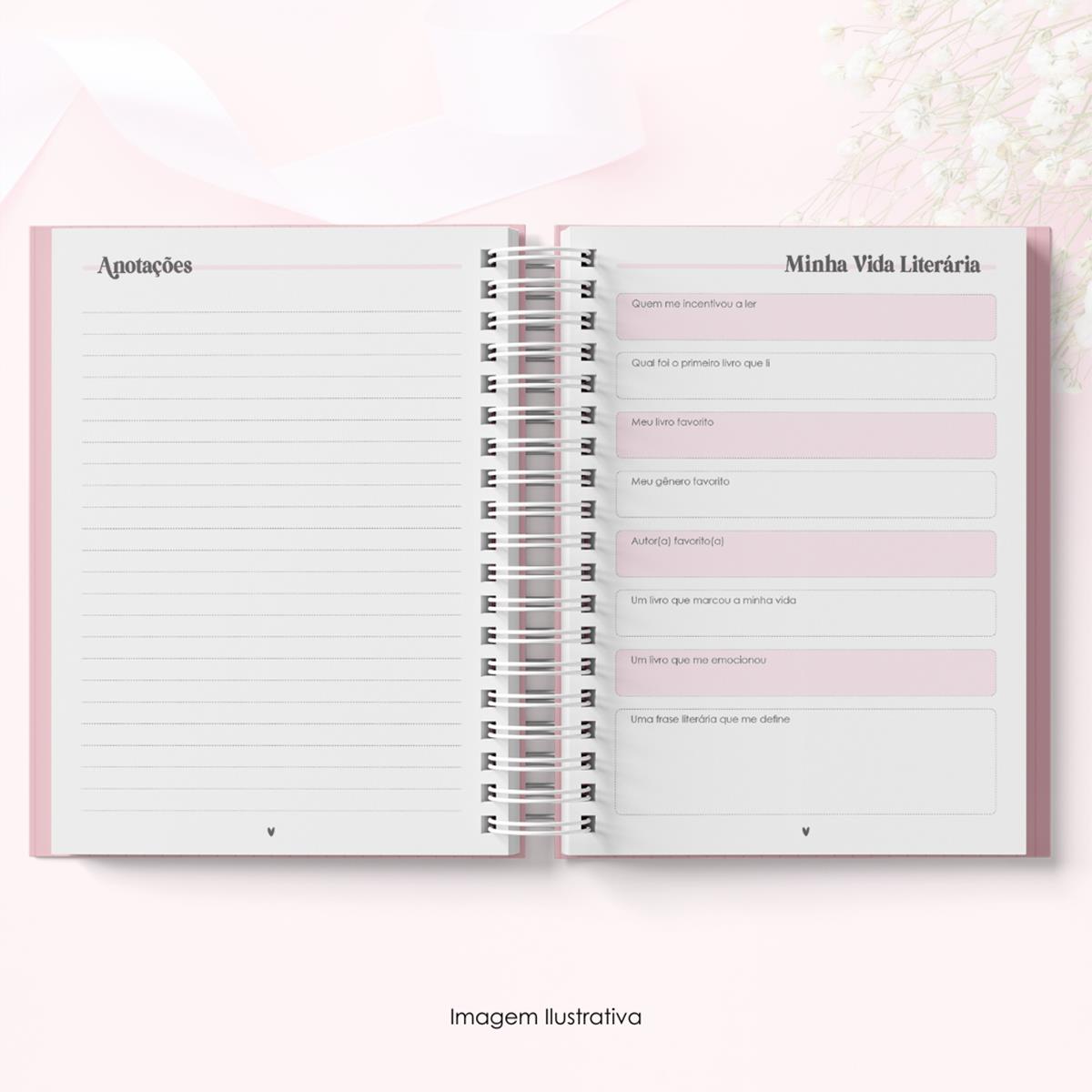 - Ficha de leitura: Páginas dedicadas para registrar os dados do livro, avaliação, resumo e comentários.